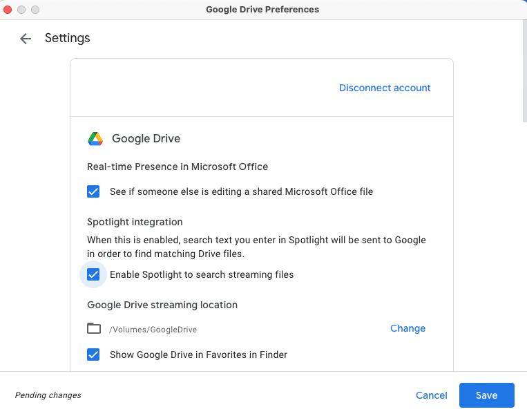It is well known and has been widely commented the problem that Apple finder has in communicating with Google Drive for desktop (DFD). You would search for anything in DFD using the finder or spotlight and nothing would come up...until now. DFD version 60.0 fixed that, just go to preferences and check the "Enable Spotlight to search streaming files" checkbox, voila! and automatically spotlight starts indexing the DFD. So it wasn’t your finder, it was DFD.