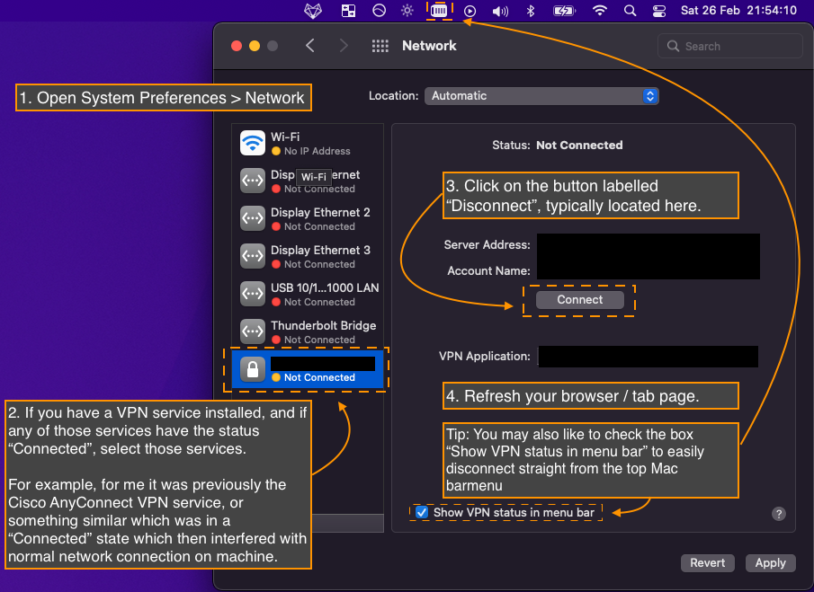 • Tip: There's also a checkbox labelled "Show VPN status in menu bar". If you check that, then you can easily disconnect the VPN service from the menu bar in future. It would save you some clicks.