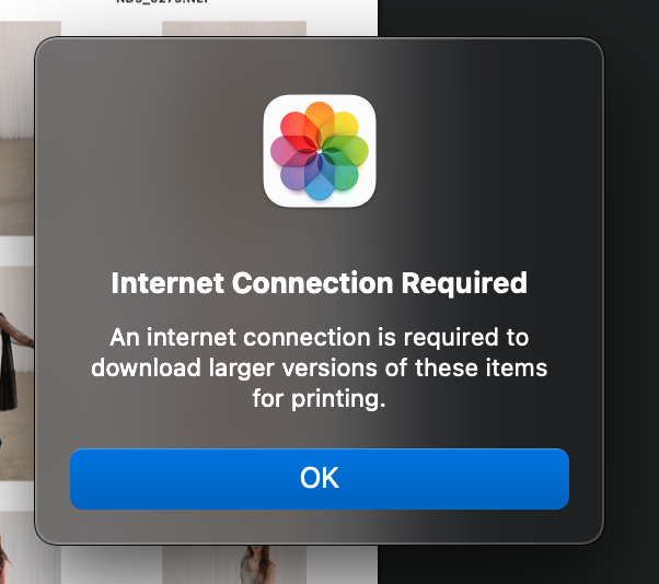 Why does Photos need an Internet connection to print a contact sheet from photos that have never been anywhere near the internet? They were captured and processed on my MacPro. Other, admittedly smaller albums, "printed" just fine, but even if I split this album into smaller lots, it insists it needs an internet connection. For what? (This message brought to you by the same Internet it claims is missing!!)