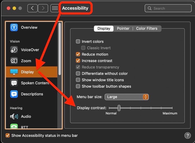 Apple Support Communities is a great place for help with the display on your Mac. It sounds as though you’re on the right track for addressing this issue as well. When going in to System Preferences > Accessibility, are you able to click Display in the left column? If so, does Display contrast appear there? If so, are you able to adjust the contrast at that time?