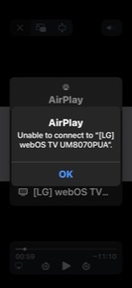 Does anyone know what this error is, it connected, fine for days and now the error? AirPlay unable to connect to LG webOS TV UM8070PUA