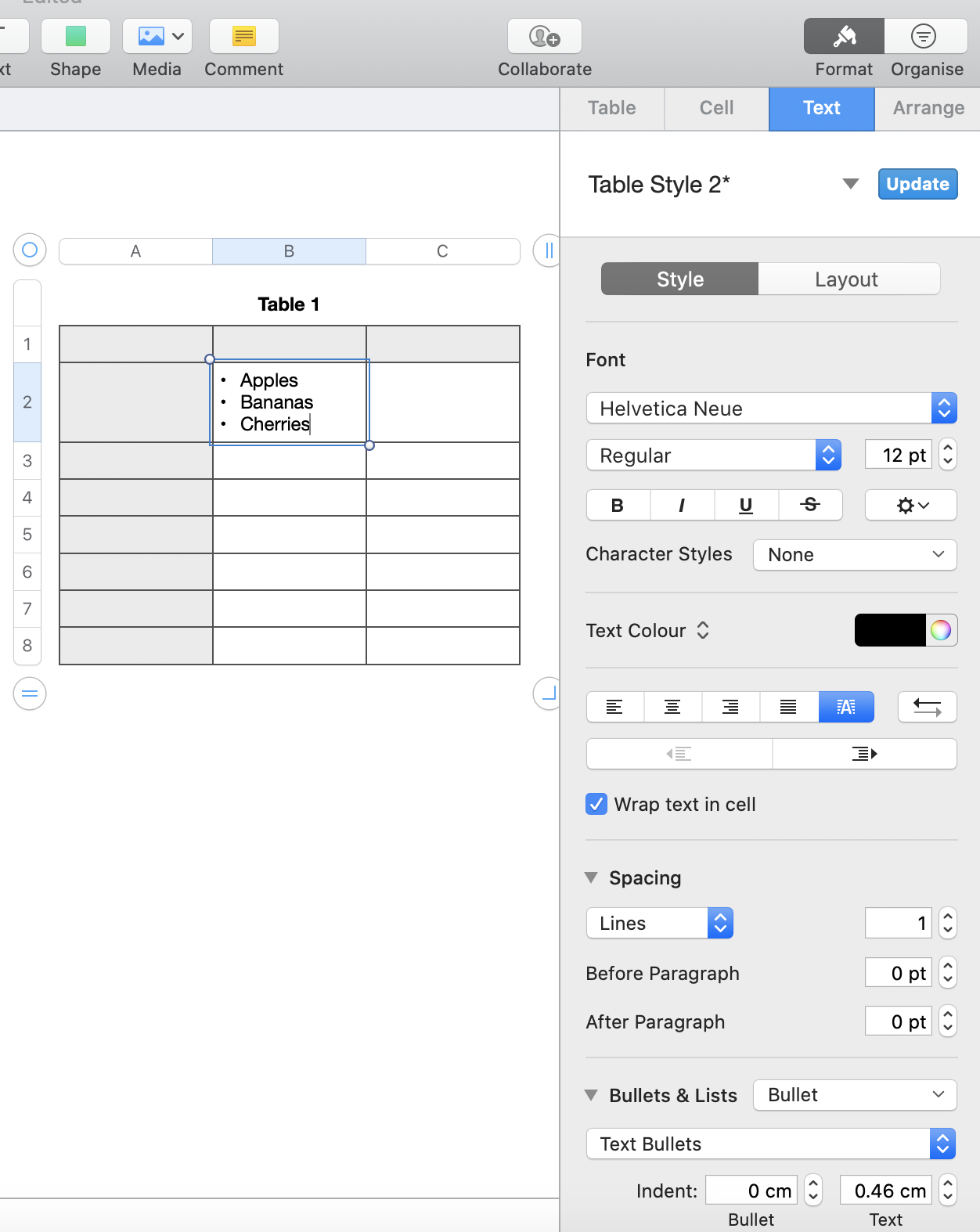 In numbers, how do I make a list within a cell? I don't want to make a text box with a list; I want it attached to/in a cell. I know I can paste a list in a cell from pages but is there a way to create and add new lines to a list without leaving numbers?