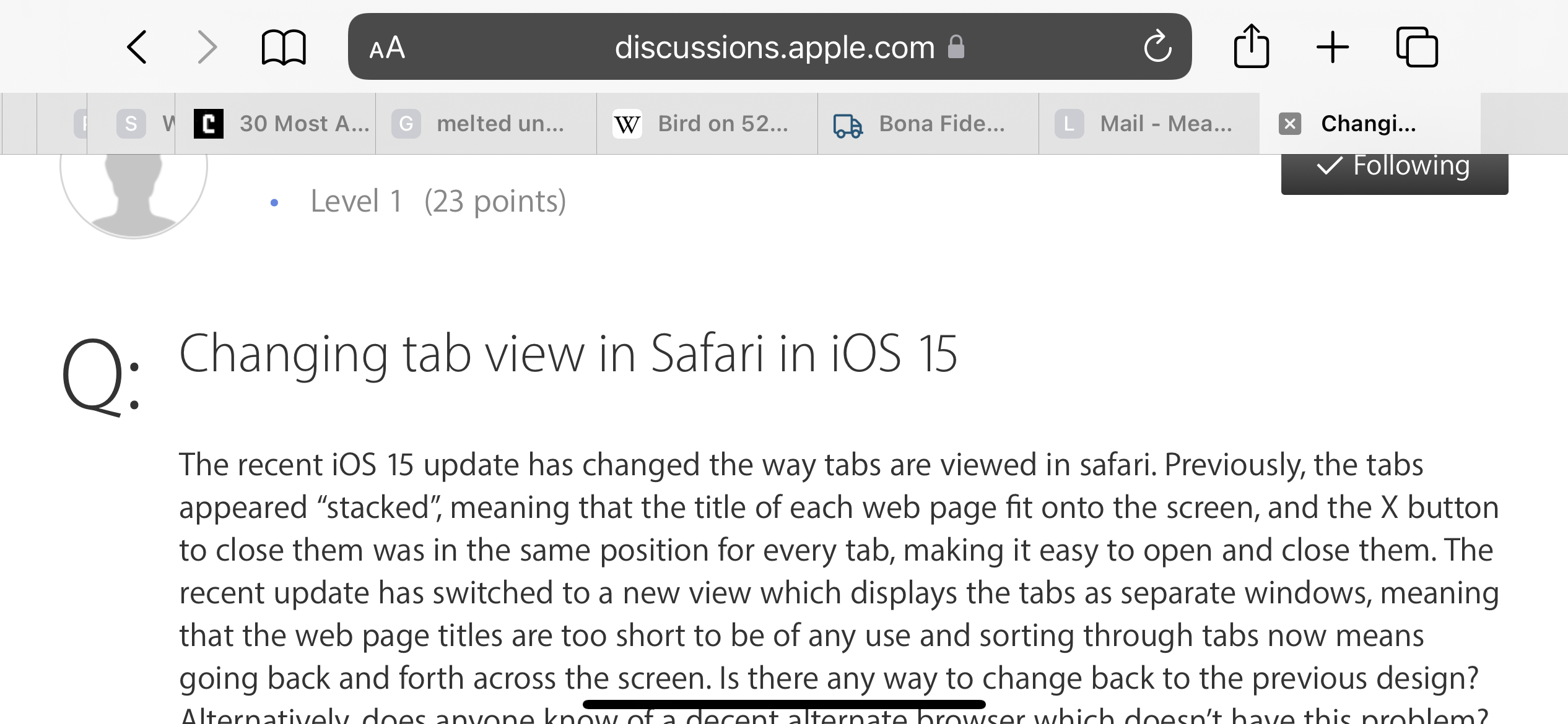 The recent iOS 15 update has changed the way tabs are viewed in safari. Previously, the tabs appeared “stacked”, meaning that the title of each web page fit onto the screen, and the X button to close them was in the same position for every tab, making it easy to open and close them. The recent update has switched to a new view which displays the tabs as separate windows, meaning that the web page titles are too short to be of any use and sorting through tabs now means going back and forth across the screen. Is there any way to change back to the previous design? Alternatively, does anyone know of a decent alternate browser which doesn’t have this problem?