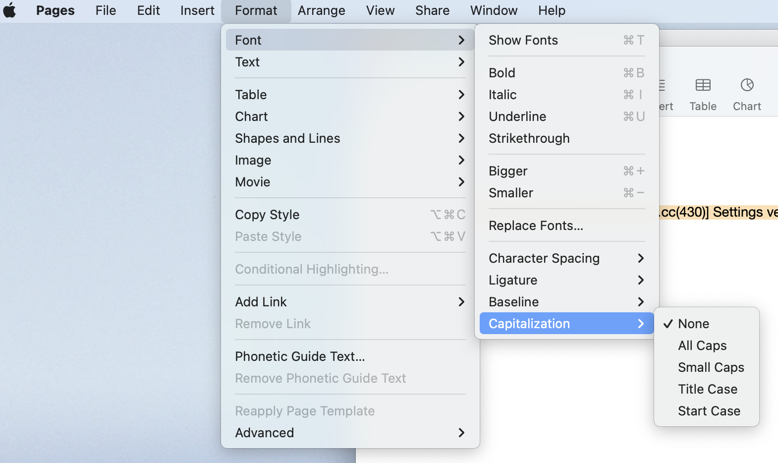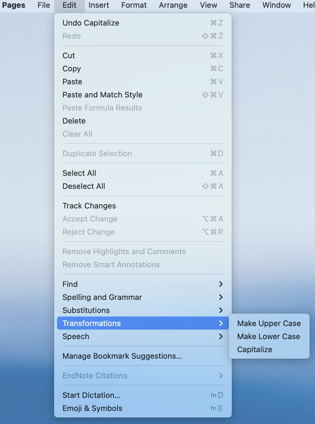 There is a handy command in Text Edit (and in other software too, such as the Finder): if there is a word or phrase that needs to be capitalized, you can select it, right-click it, and choose Transformations>Make Upper Case, Make Lower Case, or Capitalize. This is a handy way of changing the case of several words at a time without having to retype them. Oddly, I don't see the Transform contextual menu in Pages. Is this hidden somewhere else in Pages?