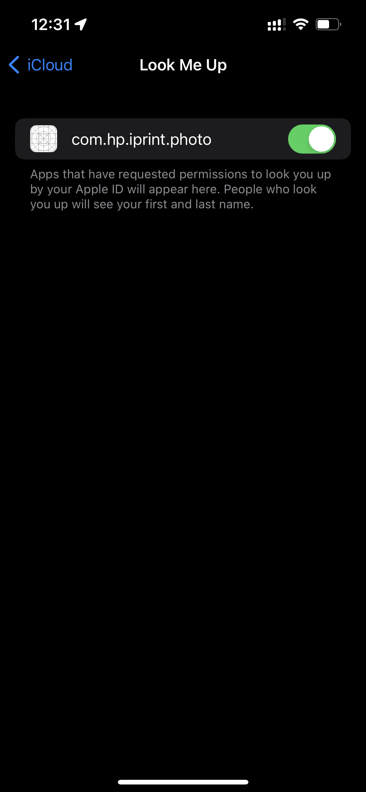 I have a new iPhone 13 Pro running iOS 15.1 while browsing settings I navigated to my Apple ID then iCloud (Storage) and scrolled to the bottom where I found “Look Me Up” there is an HP ‘address’ listed as seen in the screen print below. I have not had an HP printer in years and uninstalled the HP Printing app on my last phone. I figured this was safe to disable. As soon as I hit the slider bar to disable “Settings” crashes. Same happens after closing all apps. Same happens after a hard restart. Houston, we have a problem. What does this do and how do I disable it (without a complete phone wipe)?