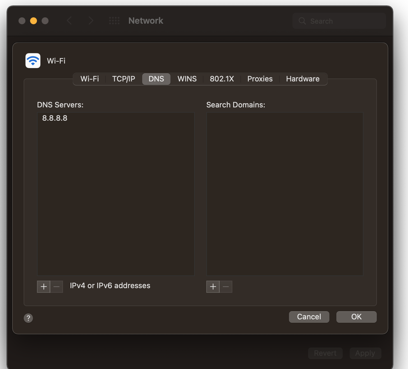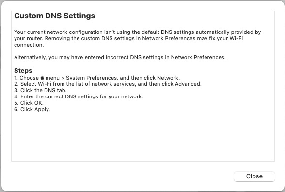 When I looked up the information attached to the error report, is says to go to the WiFI Preference and Advanced option. Then go to the DNS tab and add OpenDNS or GoogleDNS. I can't enter any text in those fields - only hex values are allowed?