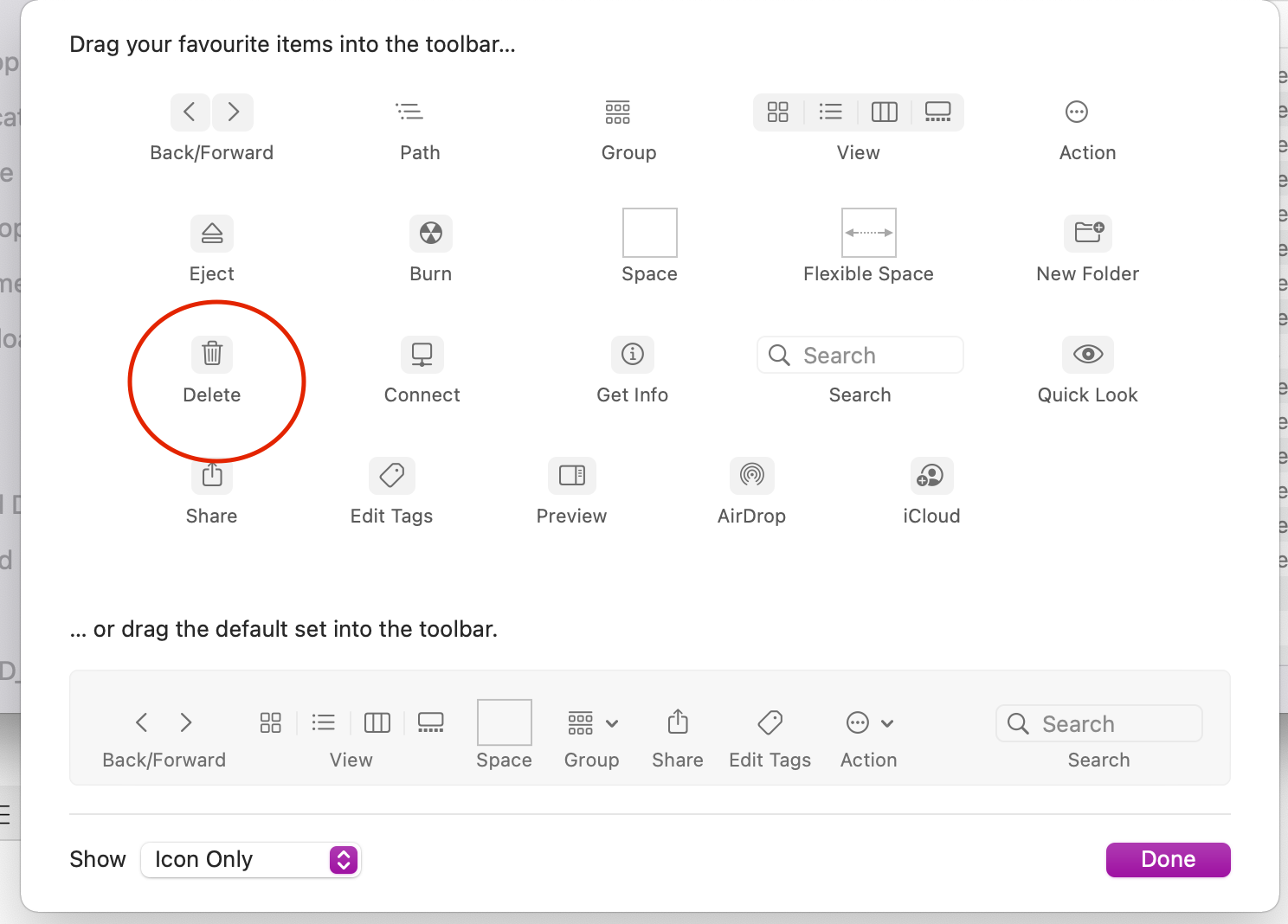 The macOS 12.0.1 Finder Windows LACK a Tool icon which, when clicked, will DELETE the selected item.
