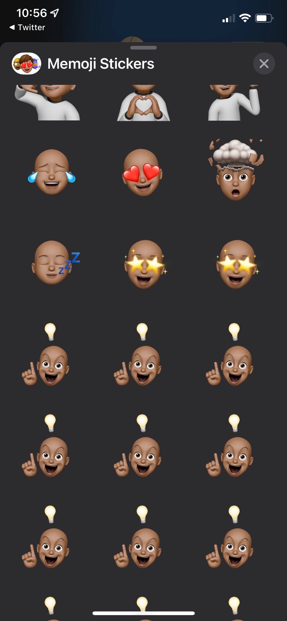this happens in both imessage and facetime, and it hasn’t been fixed even when changing the memoji. i am using iOS 15.1 currently. there are a few other memoji stickers that are regular, but they start to glitch at about the third row. (pic for example)