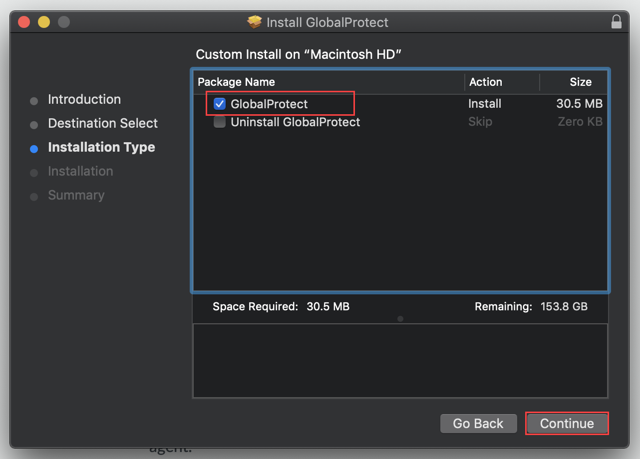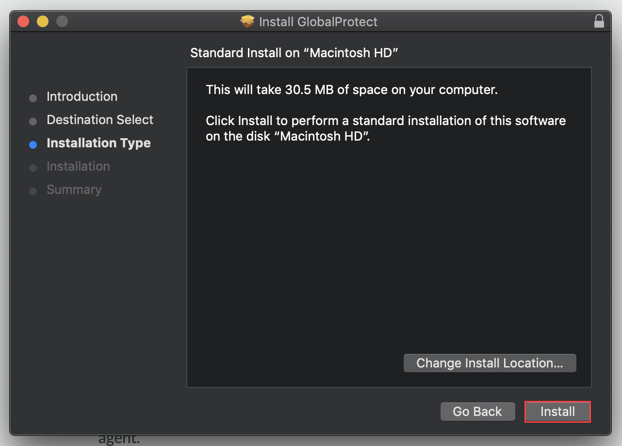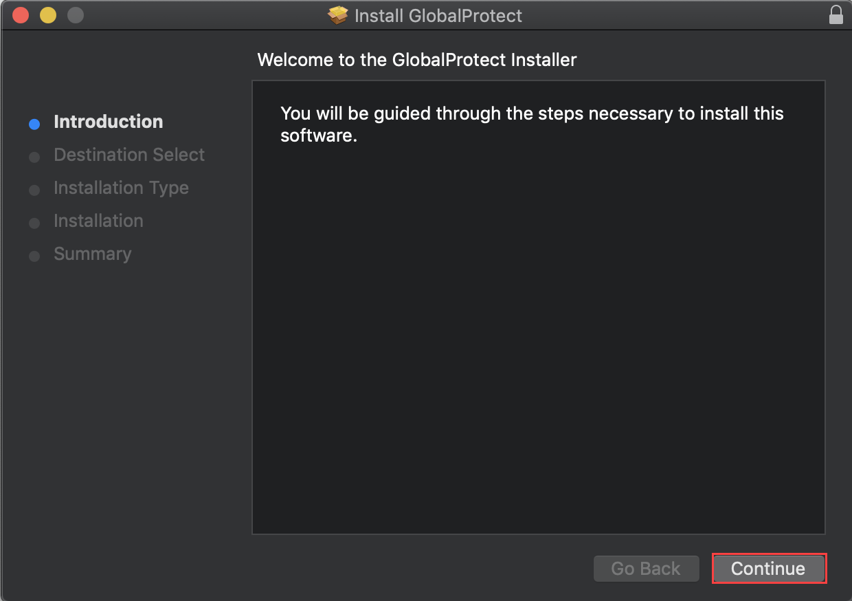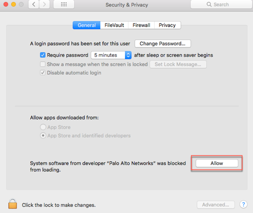 Note: For macOS 10.13 and later releases only: you have to allow Palo Alto Networks in Mac Security & Privacy as part of your initial setup. If you are prompted with a system extension block, follow the on-screen instructions to allow GlobalProtect to install the extensions. Go to System Preferences, Security & Privacy, General and select Allow and then close the Security & Privacy window.