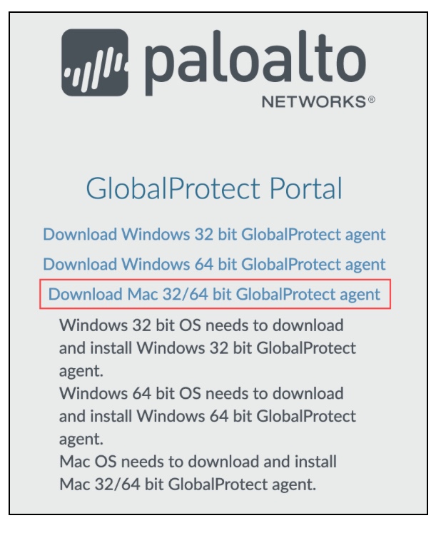 2.Click the Download Mac 32/64-bit GlobalProtect agent link to download the installer to your computer.