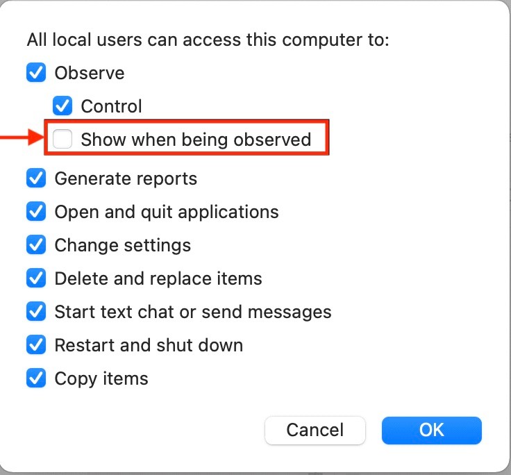 After upgrading to Monterey, the "Show when being observed" checkbox has been removed and now the new macs show the message on the login screen when we remote in and it will show a pop-up on the top menu bar when an admin remotes in while the client is logged in. Personally I like the user to know when I am remoting in so they understand why their cursor is jumping around on the screen and they know when I am done. But there are valid reasons for hiding this in a company setting.