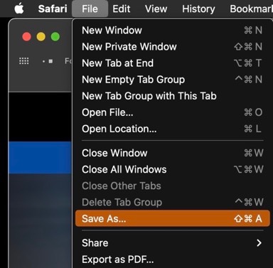 Which exact app are you using that you cannot find the "Save As" option? It appears, from what you provided, it could be Safari ... is that correct?