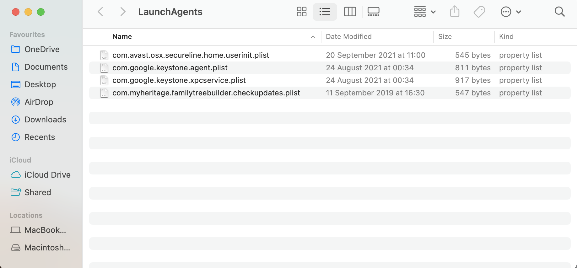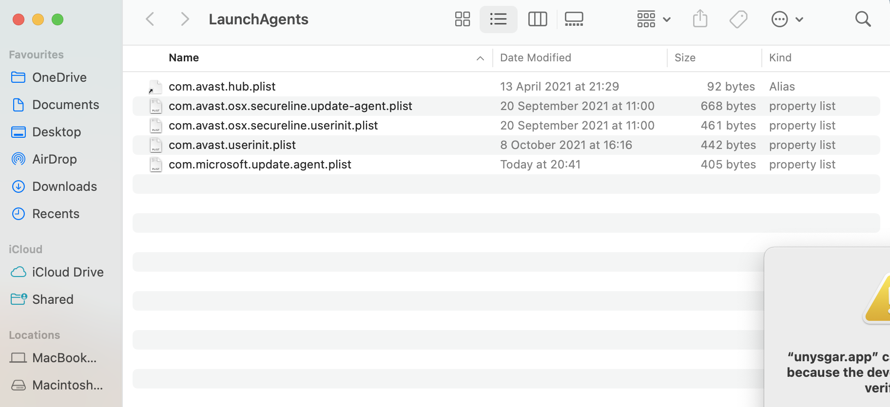 my mac says "unysgar.app" can't be opened... I read a thread where someone was asked to send screenshots of~/Library/LaunchAgents, /Library/LaunchDaemon and /Library/LaunchAgents. I am not sure what to delete out of these folders?