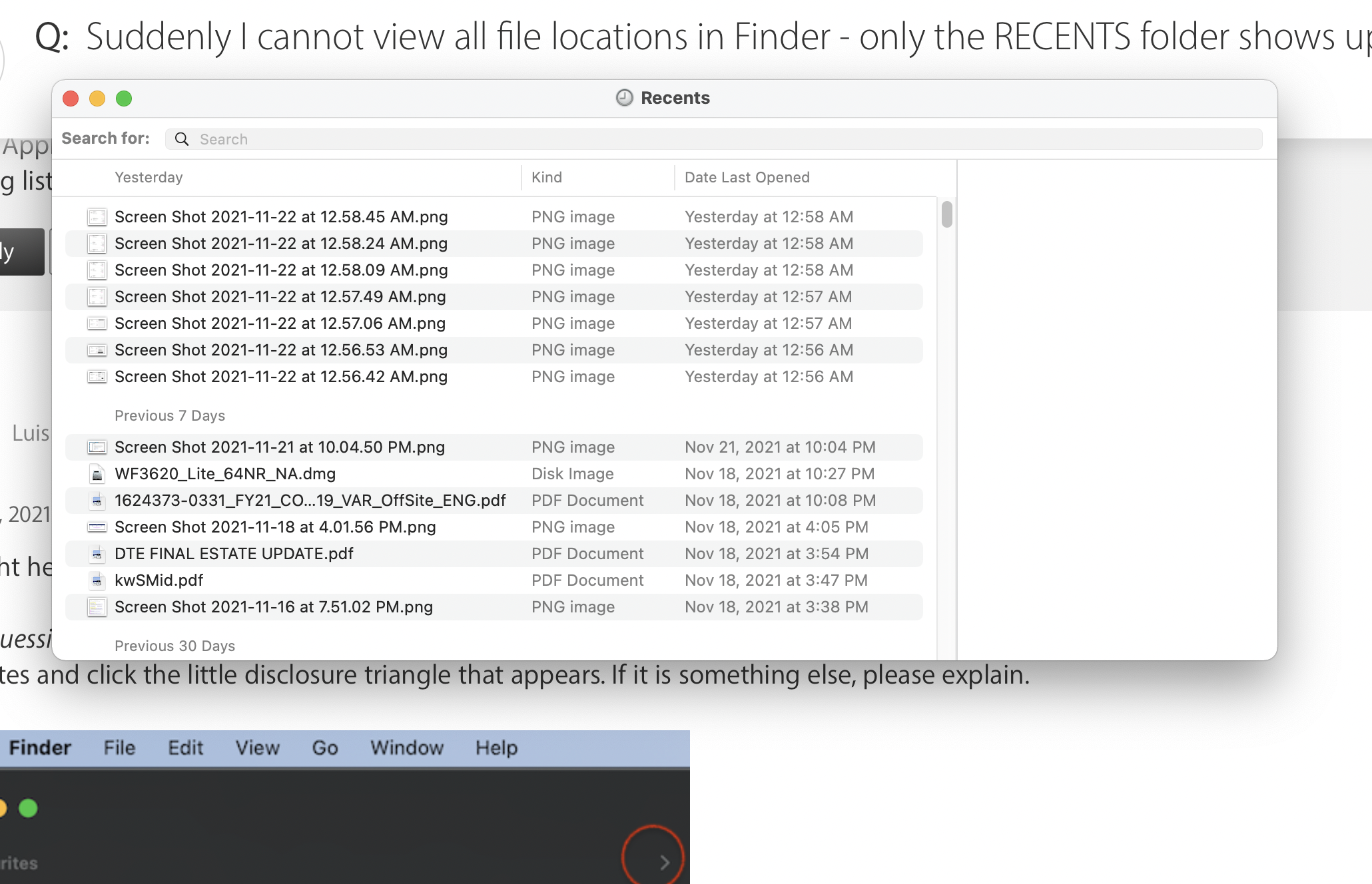 Suddenly I cannot view all file locations in Finder - only the RECENTS folder shows up