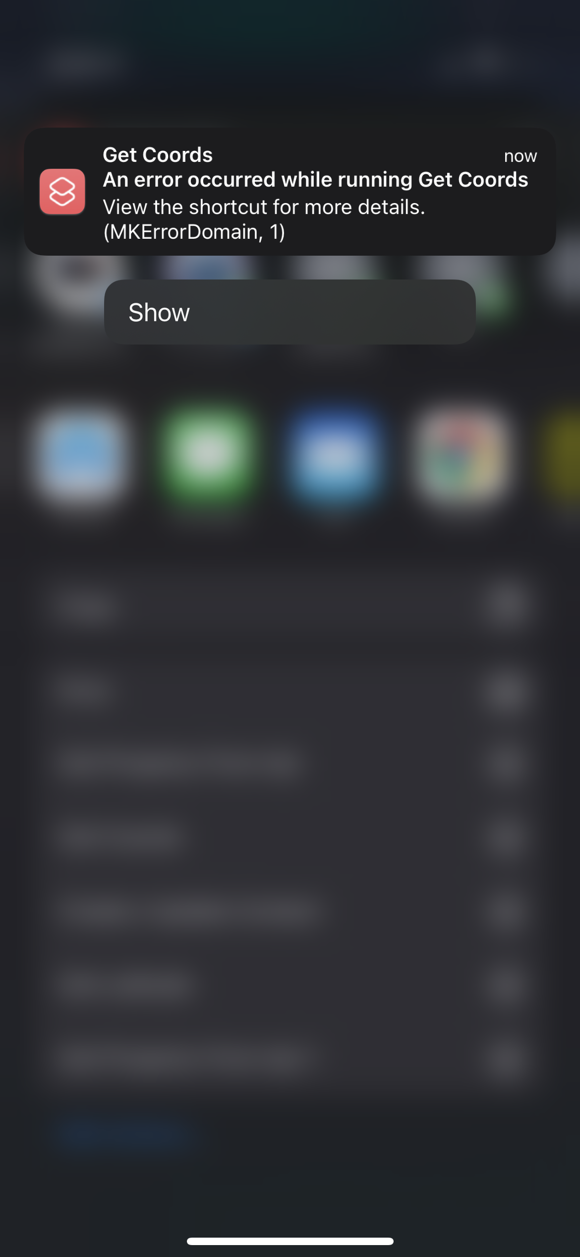 For example, on a dropped pin in maps I would share to my shortcut and display the latitude and longitude. Now i get (MKerrordomain, 1). Even if I try to convert to a map link, it still wont give me the latitude or longitude. I've tried to change the input type to places, location, and map link with no success. My location services are on for both shortcuts and maps.