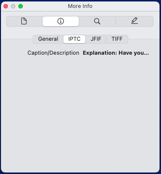 Both the IPTC and TIFF sections are now populated with the Job's speech text in the Caption-Abstract and ImageDescription keys respectively, and Photos displays this scrollable text in the Get Info window. I suspect that Photos is only dipping into IPTC:Caption-Abstract, and not TIFF:ImageDescription, but hard to tell since both get written in my command-line above.