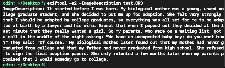I have a Canon EOS R5 RAW image that I ran the following on it with the Job's speech text, and the ImageDescription data was written correctly, according to ExifTool, but nothing appeared from my Python program, or in the Photos Caption field.