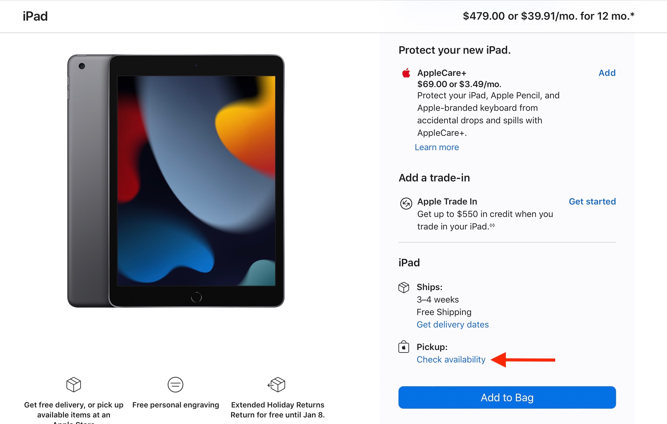 Check the "In Store Pickup" in the online Apple Store for specific information on the iPad Model and configuration you want and a store near you.