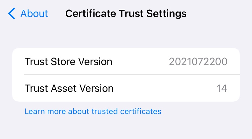 How do I update to the current trust certificate store certificates? I am having serious security issues. iPhoneXR running iOS 15.1 trust store version 2021072200