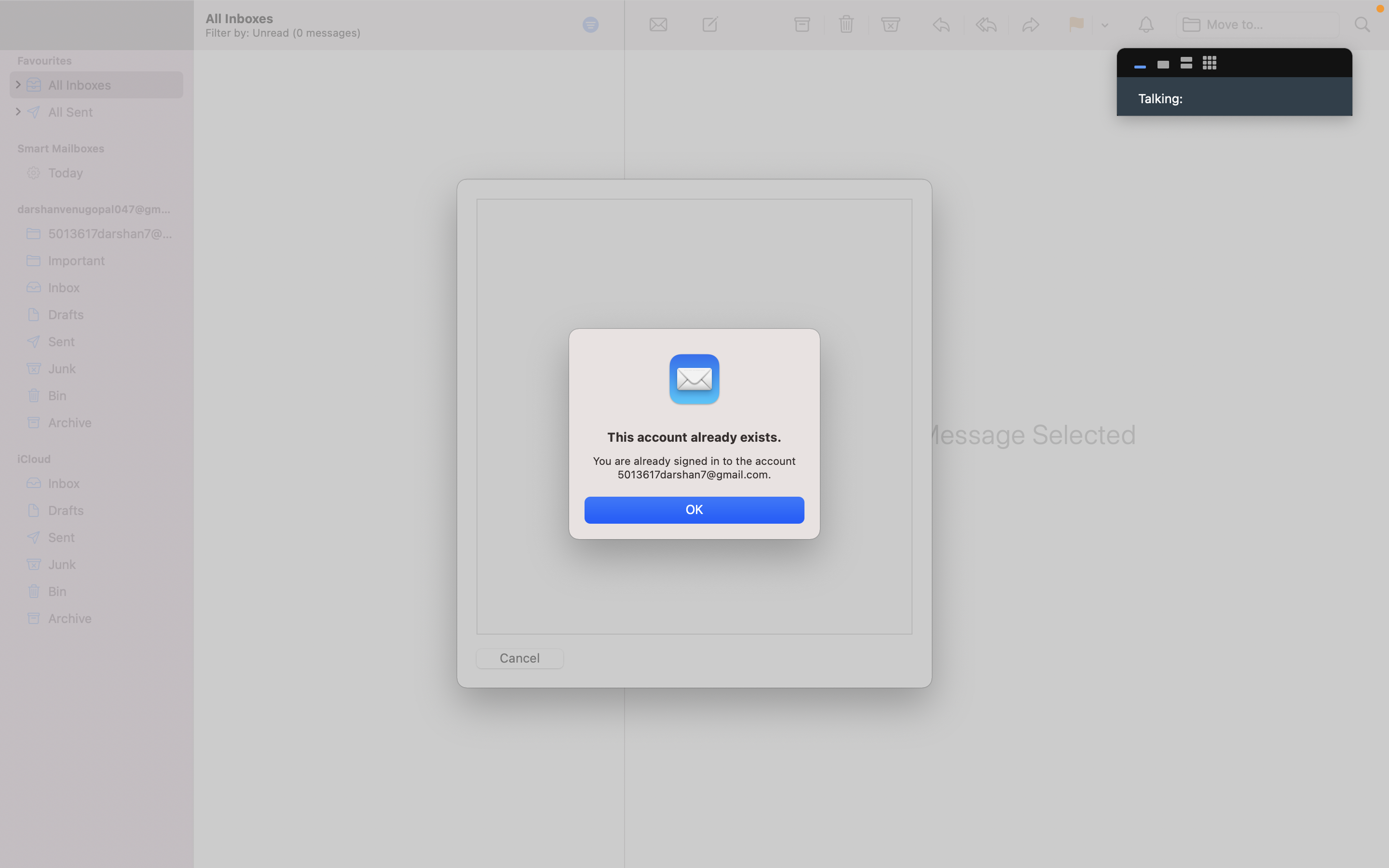 in my Mac, the mail is showing if I give my mail account, it is showing this account already exists