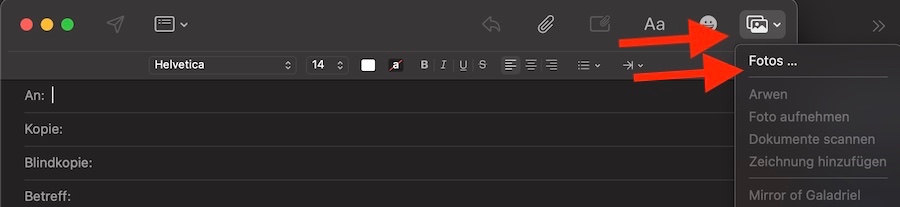 You can also use the image icon, and then drag an image from the photos app. This will appear as an image in the email, and will be converted to jpg.