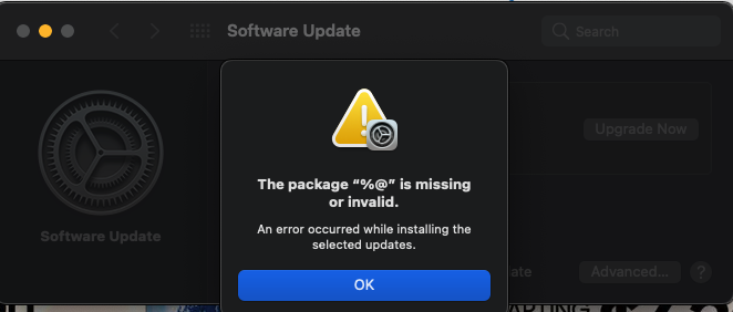 I am trying to update my Mac mini from Big Sur 11.6.1 to Monterey . When I am trying to install the upgrade, it fails with the error as'The package %@ is invalid' (screenshot ). Any fix for this ?