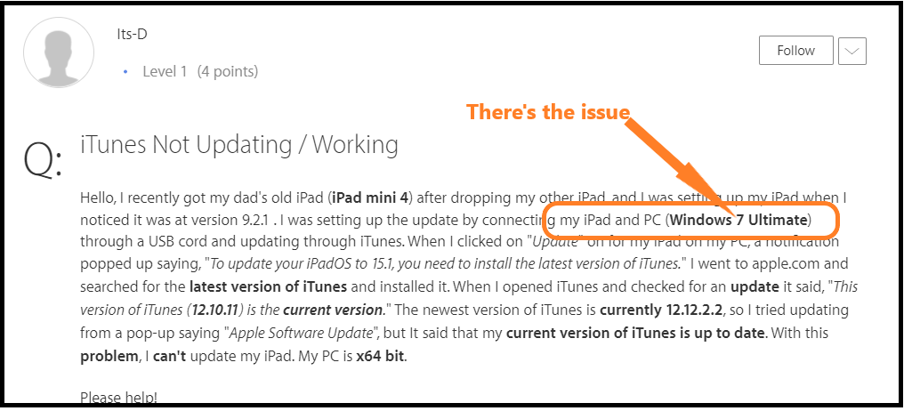 Hello, I recently got my dad's old iPad (iPad mini 4) after dropping my other iPad, and I was setting up my iPad when I noticed it was at version 9.2.1 . I was setting up the update by connecting my iPad and PC (Windows 7 Ultimate) through a USB cord and updating through iTunes. When I clicked on "Update" on for my iPad on my PC, a notification popped up saying, "To update your iPadOS to 15.1, you need to install the latest version of iTunes." I went to apple.com and searched for the latest version of iTunes and installed it. When I opened iTunes and checked for an update it said, "This version of iTunes (12.10.11) is the current version." The newest version of iTunes is currently 12.12.2.2, so I tried updating from a pop-up saying "Apple Software Update", but It said that my current version of iTunes is up to date. With this problem, I can't update my iPad. My PC is x64 bit.