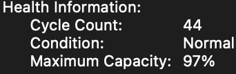 Battery health, i.e. Capacity percent is non linear. Having dropped 3% in 44 cycles is not a disaster. In fact it my rise and fall slightly from time to time as the battery ages. What I'm seeing with my 2016 MBP is the % dropped and then settled out. Right not it's sitting at about 89% but hasn't changed in over a month. It may have been "stable" a lot longer as I don't check it often at all.