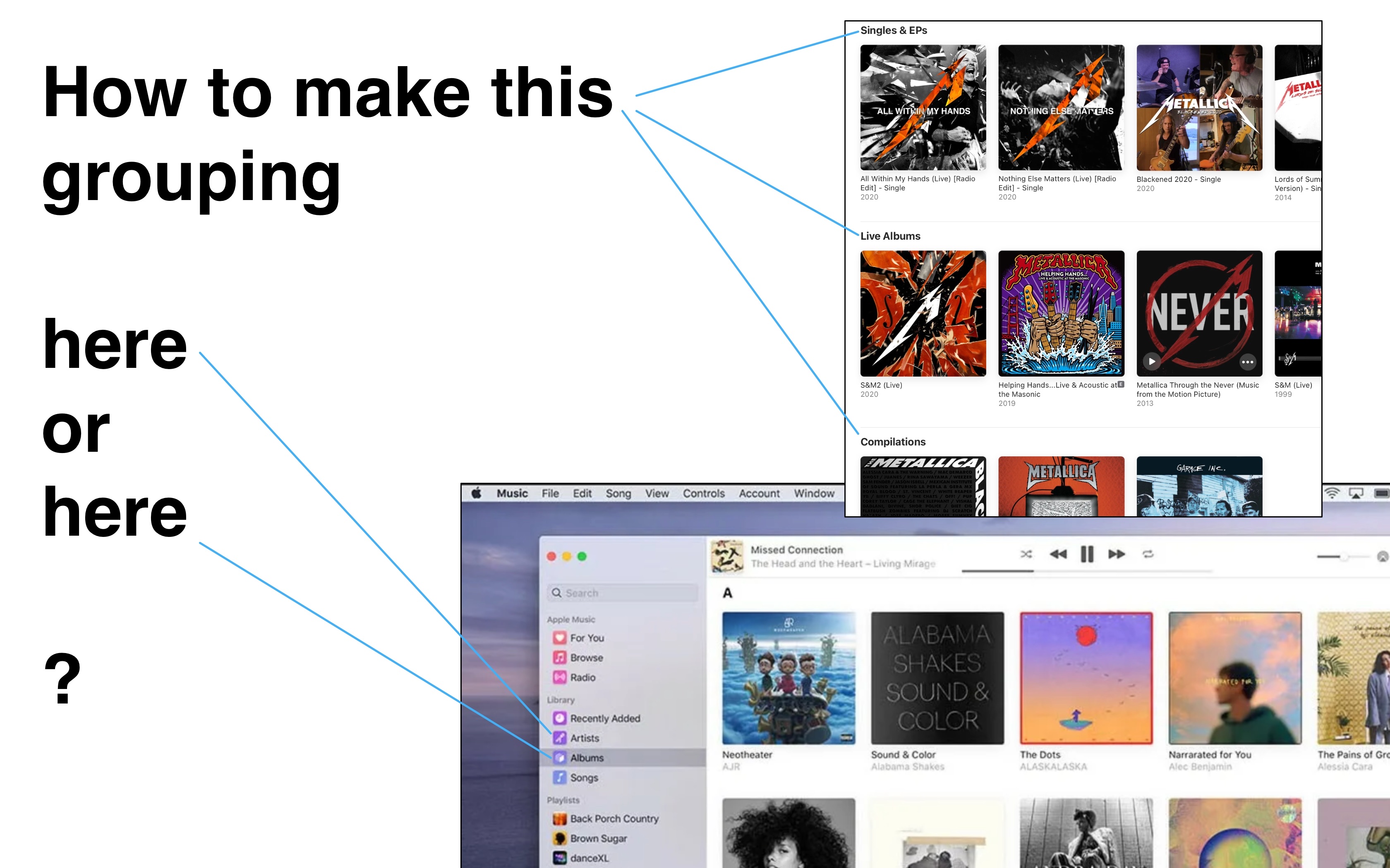 Thank you for using Apple Support Communities. We understand you would like to group your albums by Albums, EPs & Singles, Live Albums in your Music library and we'd like to help.
