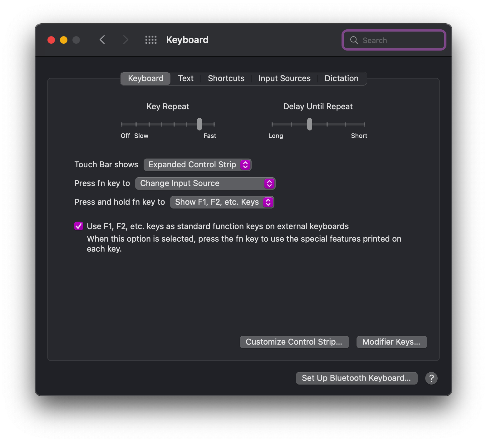 The backlight on my keyboard for my 2019 MacBook Pro 15" is not adjustable and is always dark after my computer starts up. It does turn on (lights up to max. brightness) when I turn on or re-start my computer, suggesting that this is not a hardware issue. The touch bar (including backlighting) is working perfectly and keys on the keyboard all work. My touch bar and control centre still show the icons and slider bar, respectively, for adjusting keyboard brightness. Upon touching and clicking these options, respectively, the icons light up and slider bar slides but will not stay where i slide it to—it just jumps back to the off position. The keyboard brightness setting are completely absent from my system preferences (see screen grab below). Aside from the backlighting for the keys, my keyboard is working normally with zero issues.