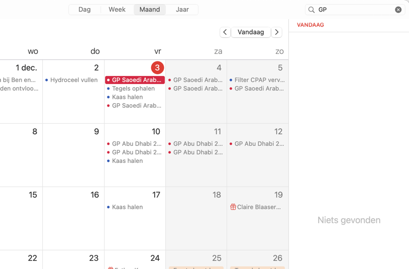 A partial screenshot of my Calendar app is included in this message. I typed "GP" in the search field, and as you can see, there are more than one events in my Calendar that start with "GP". But no search results are displayed. In the lower right corner of the screenshot you can read "Niets gevonden", which is Dutch for "Nothing found".