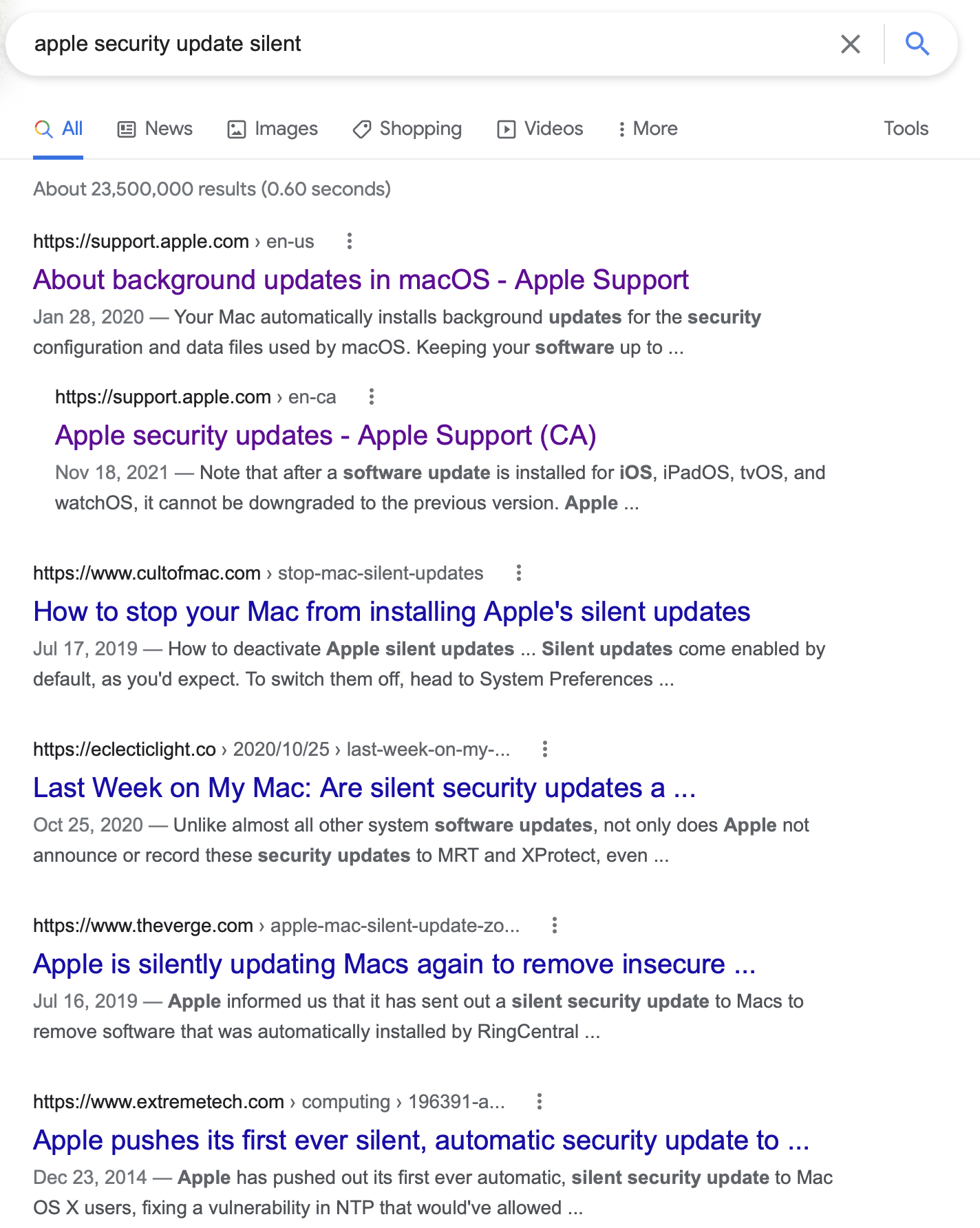 The first two hits are from Apple, where the world "silent" does not occur at all. The next hit is a popular Mac site that flat out tells people this is something to be stopped. Then we have Howard Oakley, who doesn't know how these updates actually happen, but claims they are actually a security vulnerability.