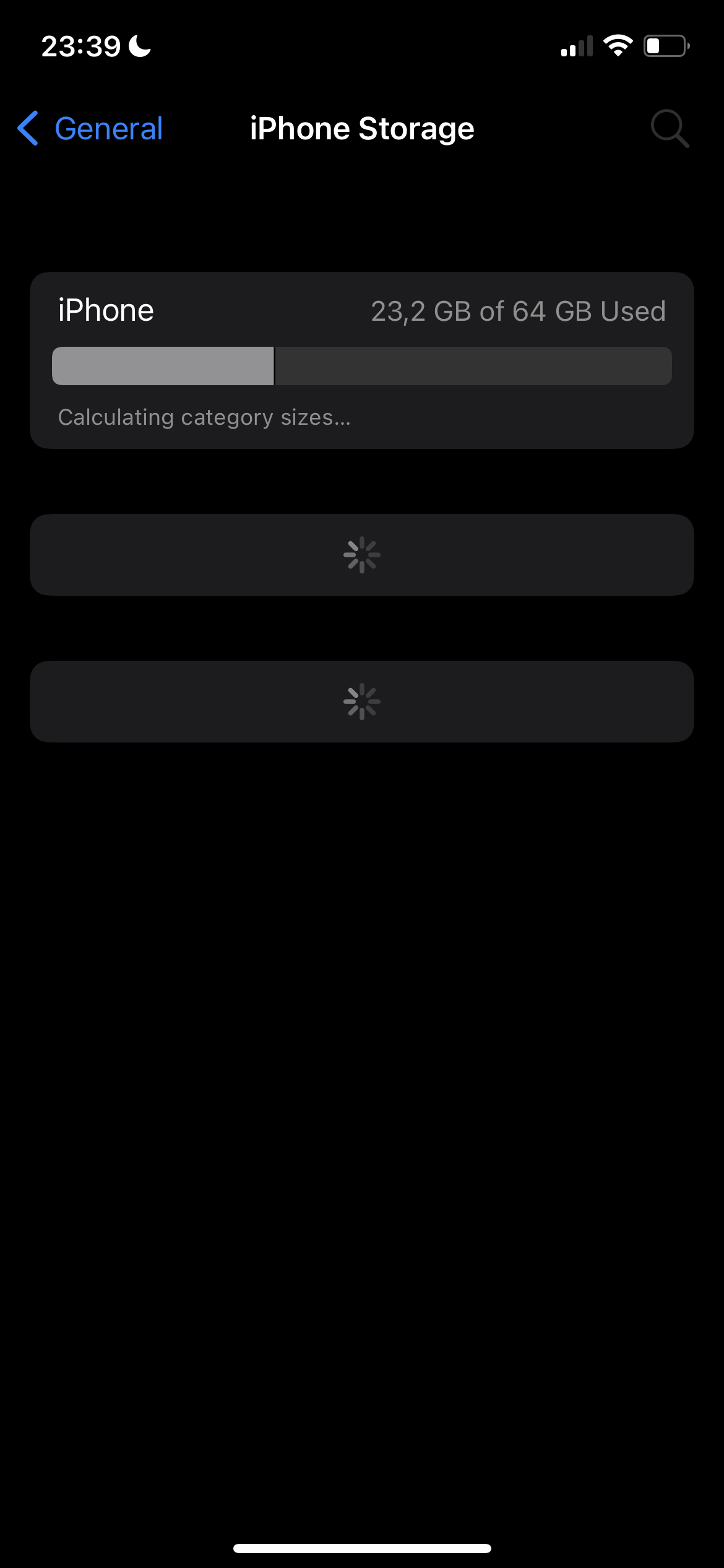 I have a 64gb iPhone 12 with iOS 1.15.1 and this issue has been going on for a while now. Most of the times my iPhone is just stuck at calculating category sizes, although a few times it manages to load even if the GB used are not always clear (for example they go from 22.8~ to 23.4~)