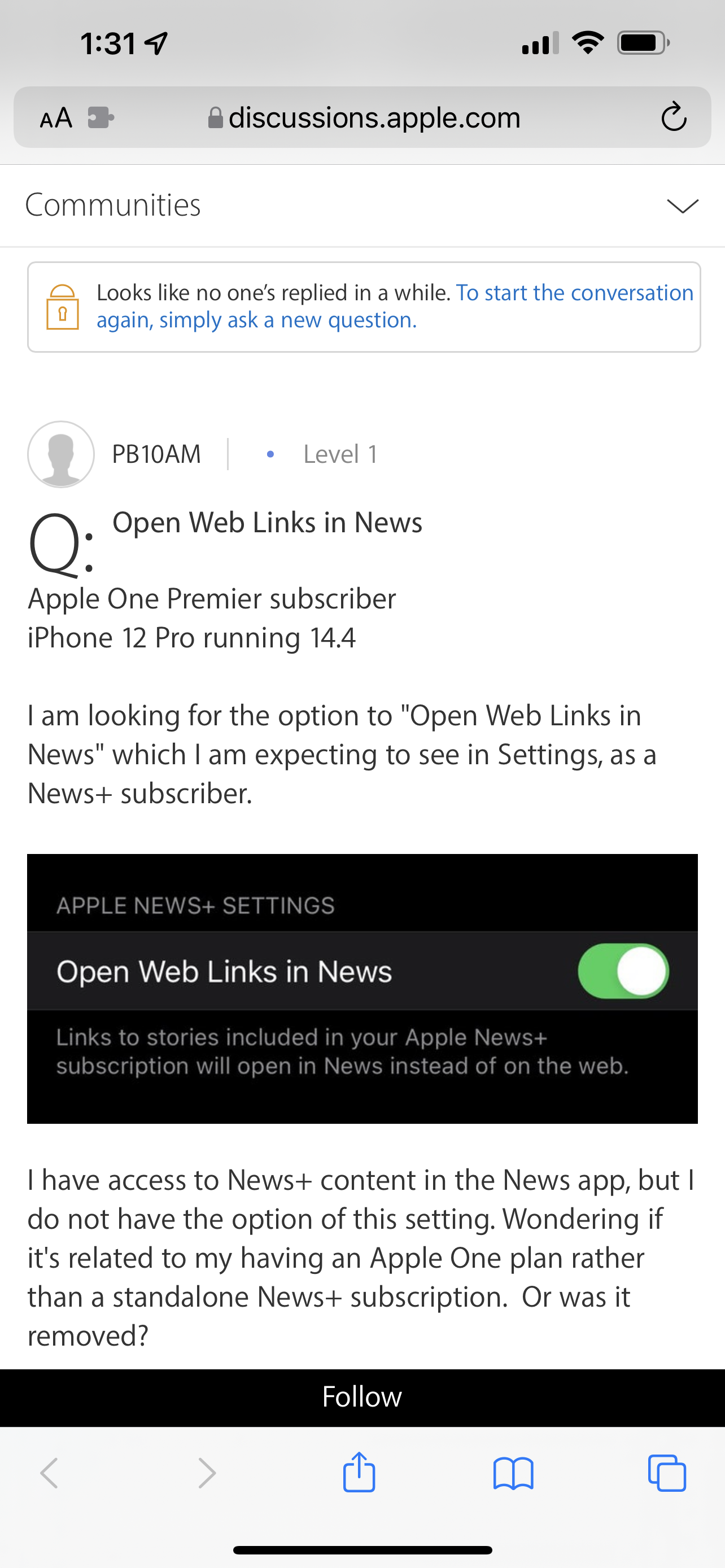 The other issue is also not what I’m asking about. I’m talking about articles that are available in News plus. This option is never available to me. And also the entire setting that would allow this to happen is completely missing from the settings app. See pic below for what I am missing