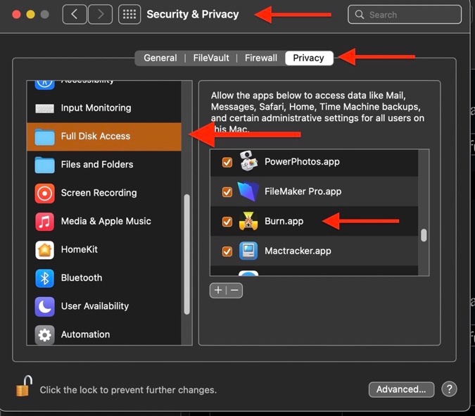 Go into System/Security & Privacy/Privacy/Full Disk Access and add Burn to it. Also make sure it's listed in the Files and Folders section.