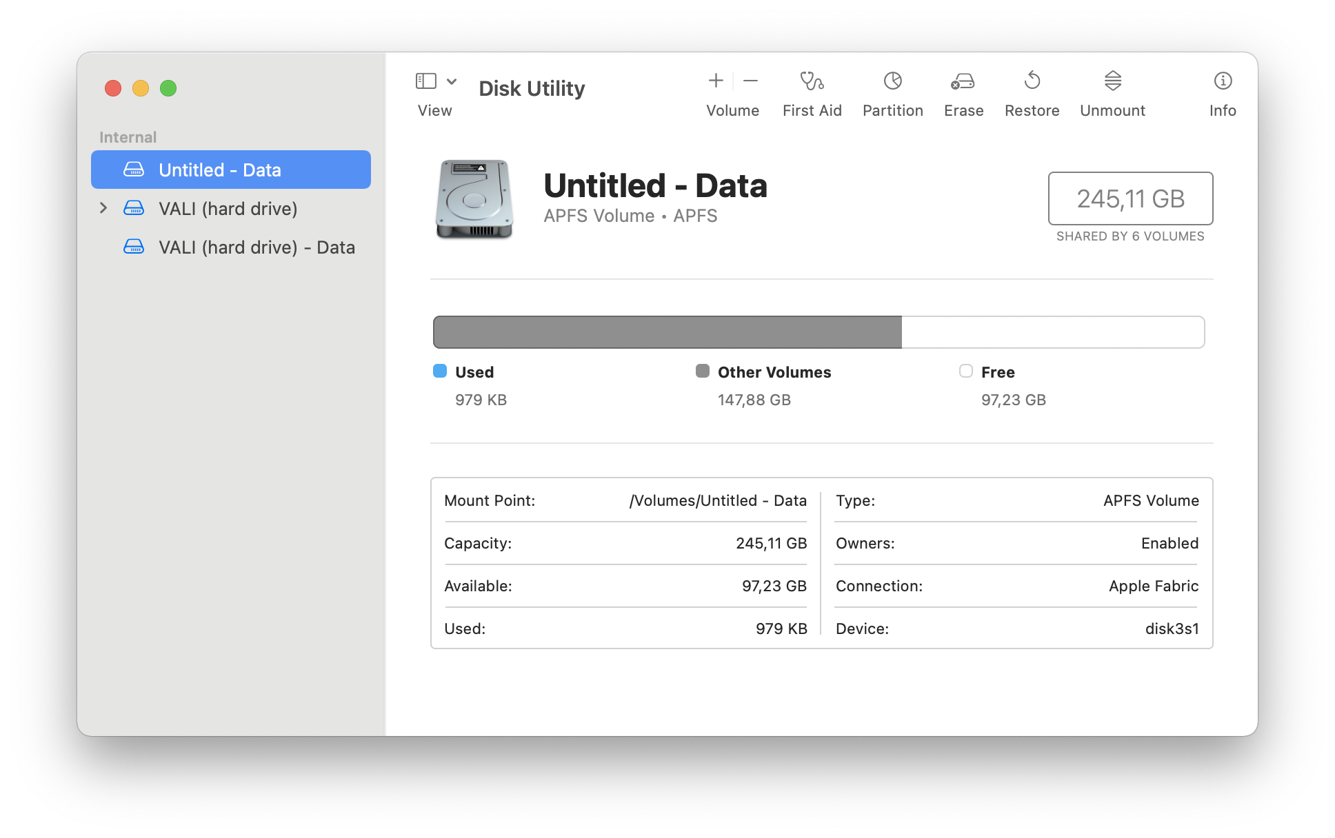 In disk utility it shows 3 hard drives, 2 of them being USER (hard drive) and USER (hard drive) - Data which I know it's normal. The problem is that I have a third one named Untitled - Data which uses only 979 KGB. I'm not sure what it does and if it is ok to erase it. I will attach a screenshot of disk utility.