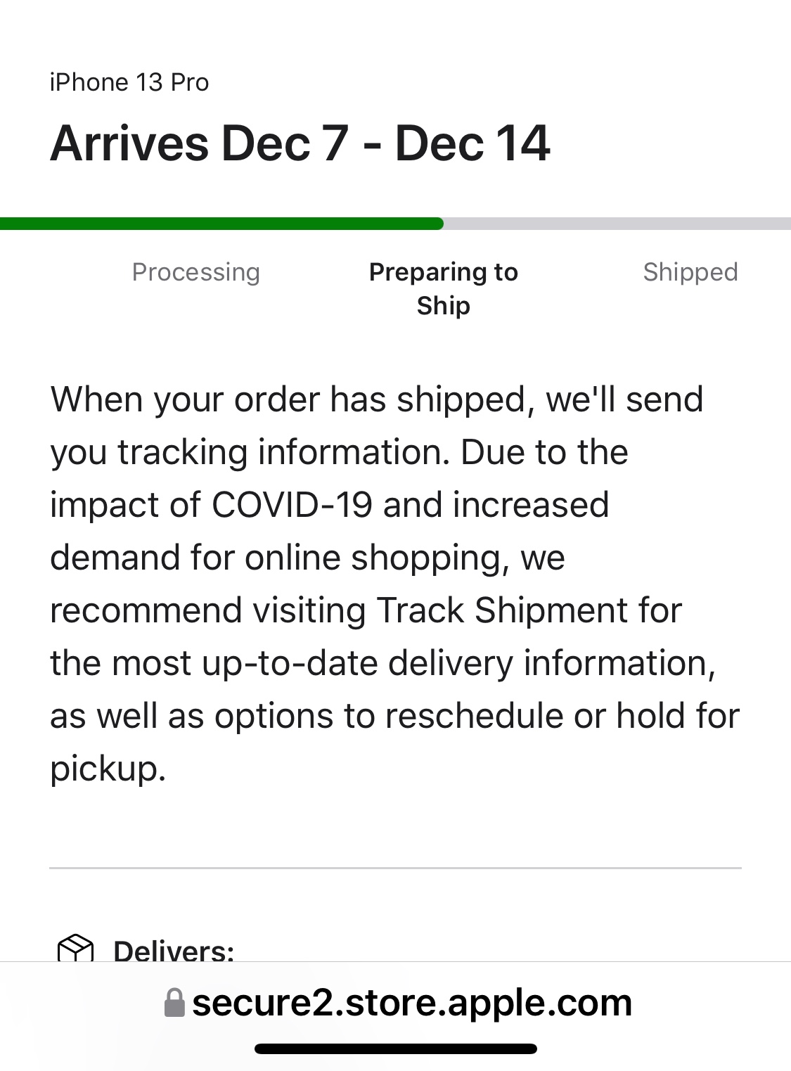 Has it shipped? I am supposed to receive my iPhone 13 Pro from Dec 16-20 and it is stuck on preparing shipment as well. Wondering if I have any chance it'll get here on the 16th.