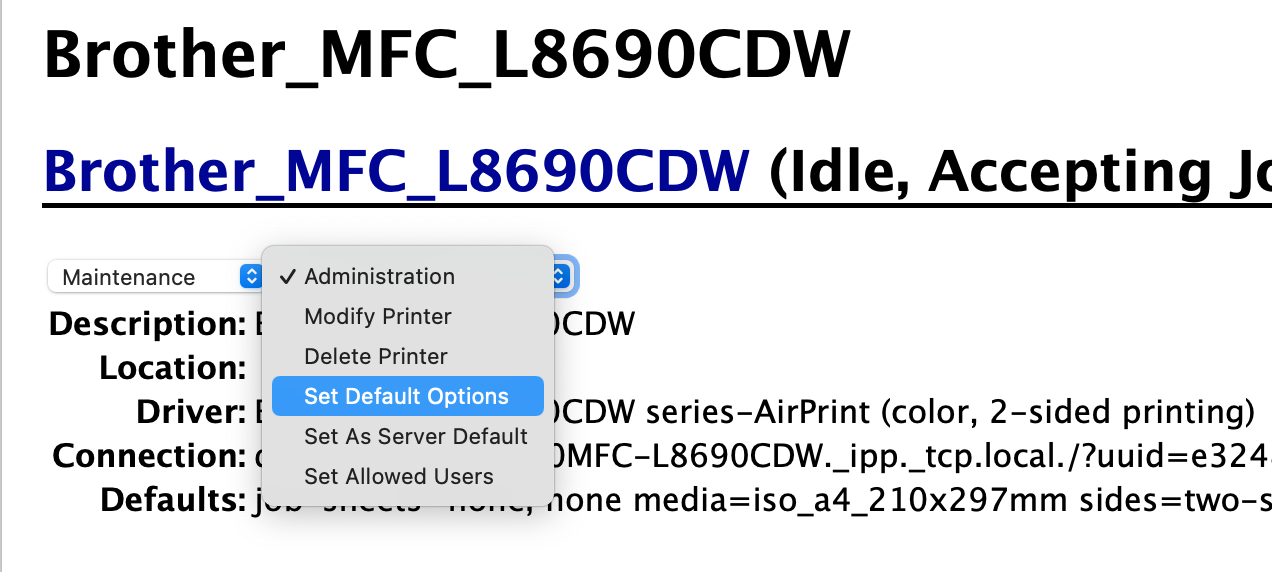 I have to print a lot of PDFs and in stead of opening each one of them, I can simply press cmd+p from the finder and they'd automatically be printed. But the default setting is two-sided and colour, while I want them to be 1 sided, b/w. In the Printers&Scanners I can only set the default size. I tried to print one "normally" from Preview, set all the settings I need, then select "Last used settings" as default, print a copy as I want it, and then go back to cmd+p for the following file, but the system switches back to colour, two-sided.