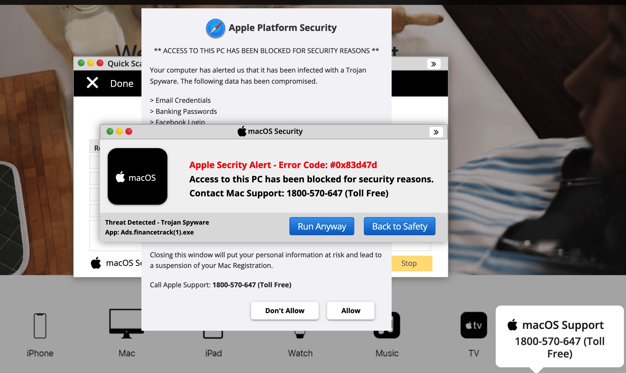Has anyone else been seeing this on Facebook? After clicking on an innocuous link an Apple background comes up (not an Apple address) & moments later this plthora of warnings pos up in a dramatic manner. Ignoring the 'threat' of losing your Mac Registration' by closing the window has no apparent effect.