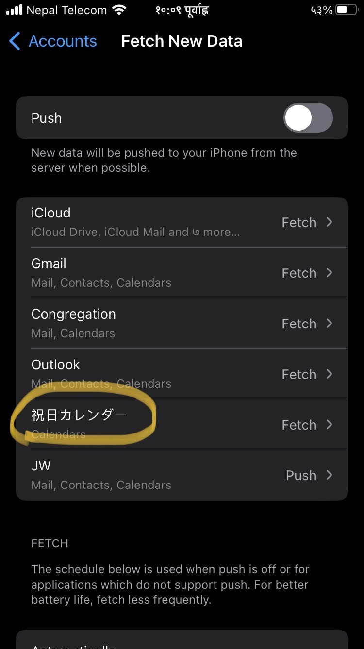 I'm on iOS 15.1 on iPhone SE 2020. Whenever I go to set up fetch new data (Mail>Accounts>Fetch New Data) an unknown Japanese word appears under calendar. Does anybody know what this is or how to get rid of this. My device is from the US not from Japan and the region is set to US and language to English (US) and Nepali but no other languages.