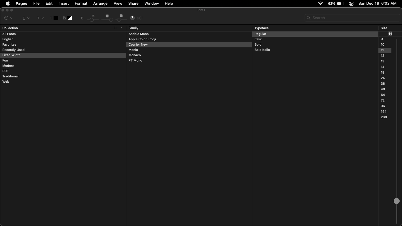 Why has the original Courier font been removed from Pages in Monterey?