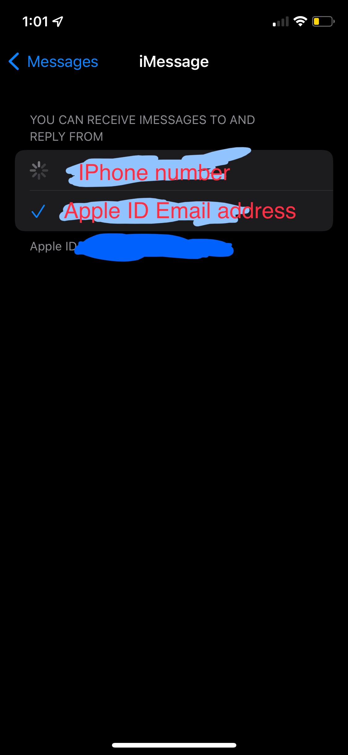 I turned my IMessages off then back on, later realising that I do have an option to start new conversations with my Apple ID email and my phone number. The issue is that when I send a message to another apple user it does not send through and shows up as a green text bubble and when I get an apple user to send me a message through IMessage it only comes through as SMS message as well. When I try to turn on my phone number in settings it has a spinning circle and i cant tick it. I’m on iPhone XS btw, someone help please!!! 😭👀