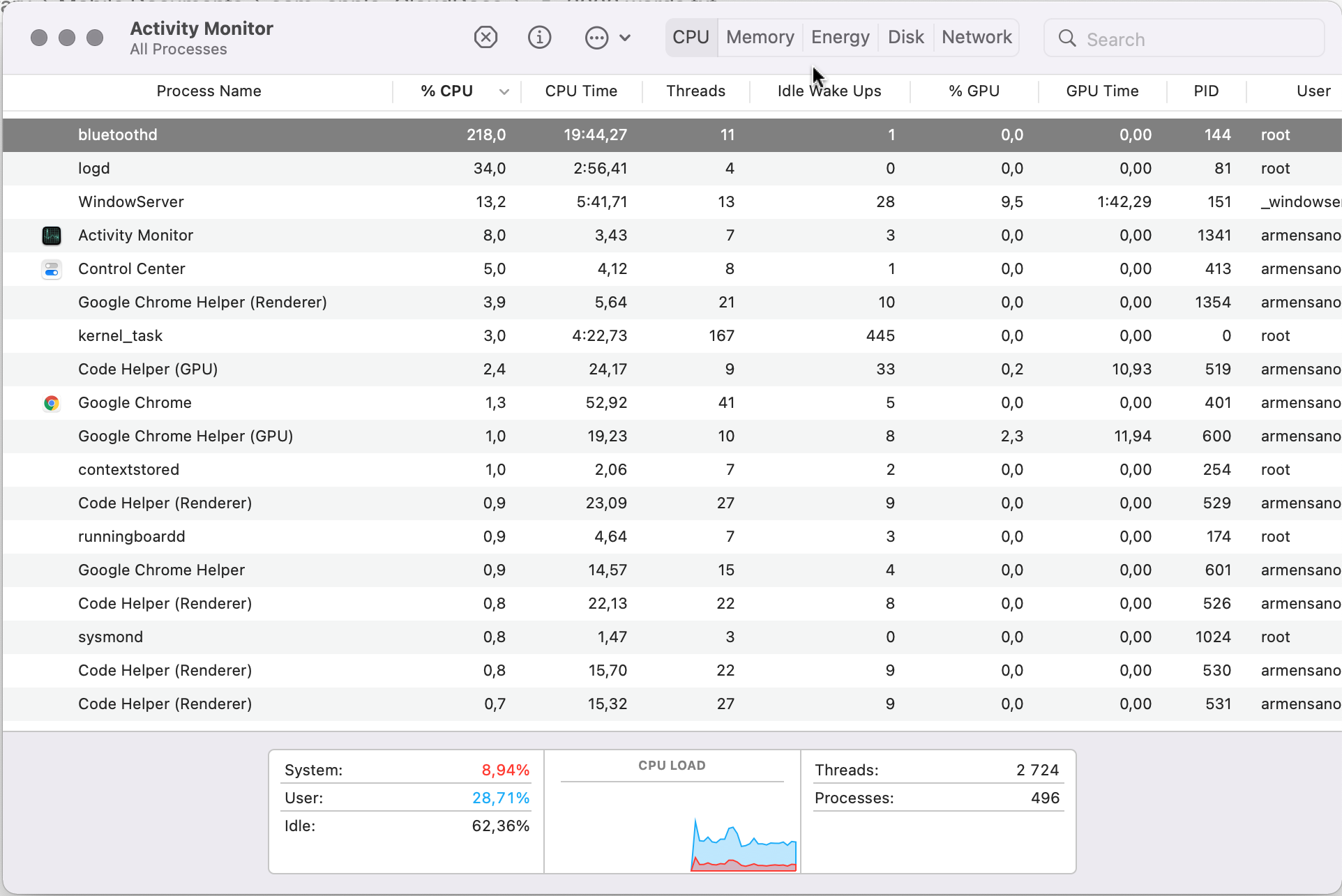 I am using macbook pro 2015 with Monterey version 12.1. Almost every time when I open the screen and login in the usage of cpu surges more then 200%. It's even stranger because mac isn't connected to any device! To fix it I turn off and on the bluetooth, which doesn't seem a good solution to me. Is there any better ways to fix it?