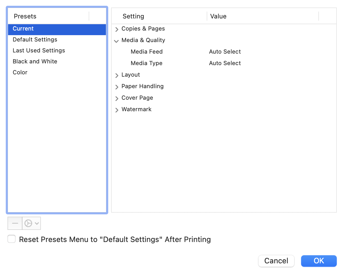 The usual print option Show Presets is present, and it contains the usual list: Copies & Pages, Media & Quality, Layout, Paper Handling, Cover Page, and Watermark.