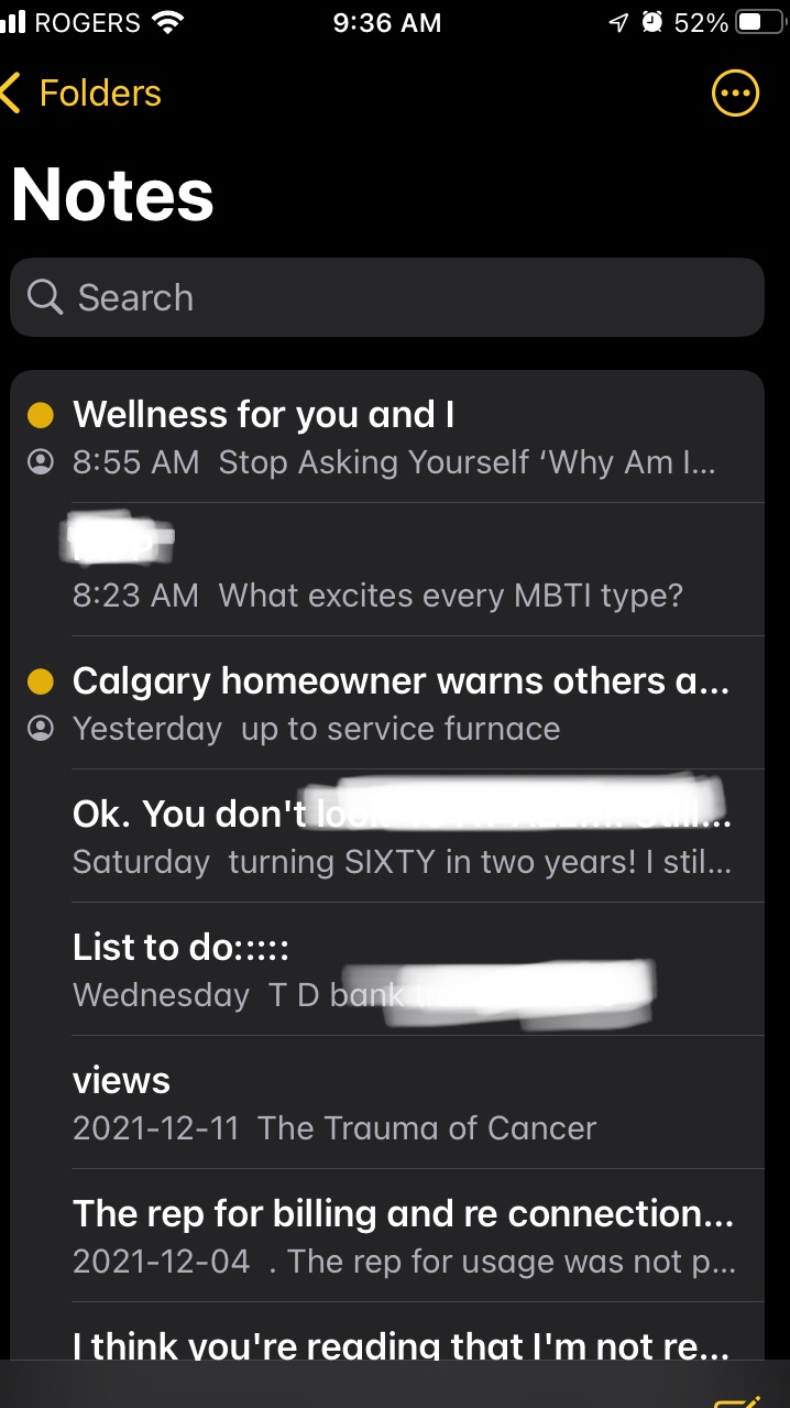 You did not mention shared Notes. See this page in the iPhone User Guide about shared notes and the dots to the left side of the Note and what it designates. Share notes and collaborate on iPhone - Apple Support