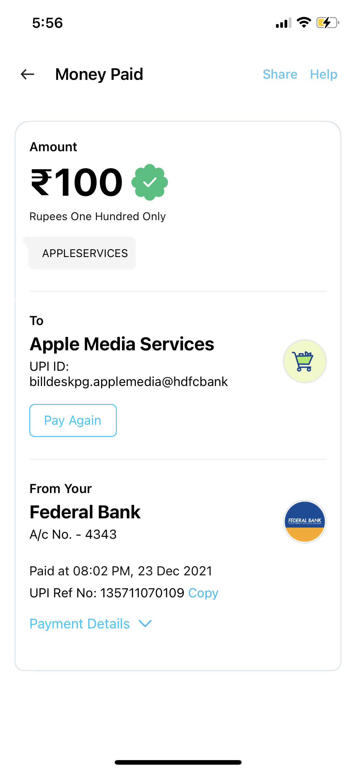 I was buying Apple Music subscription last night and I paid amount of 100 rupees twice through upi but I my Apple Music is still showing to buy subscription