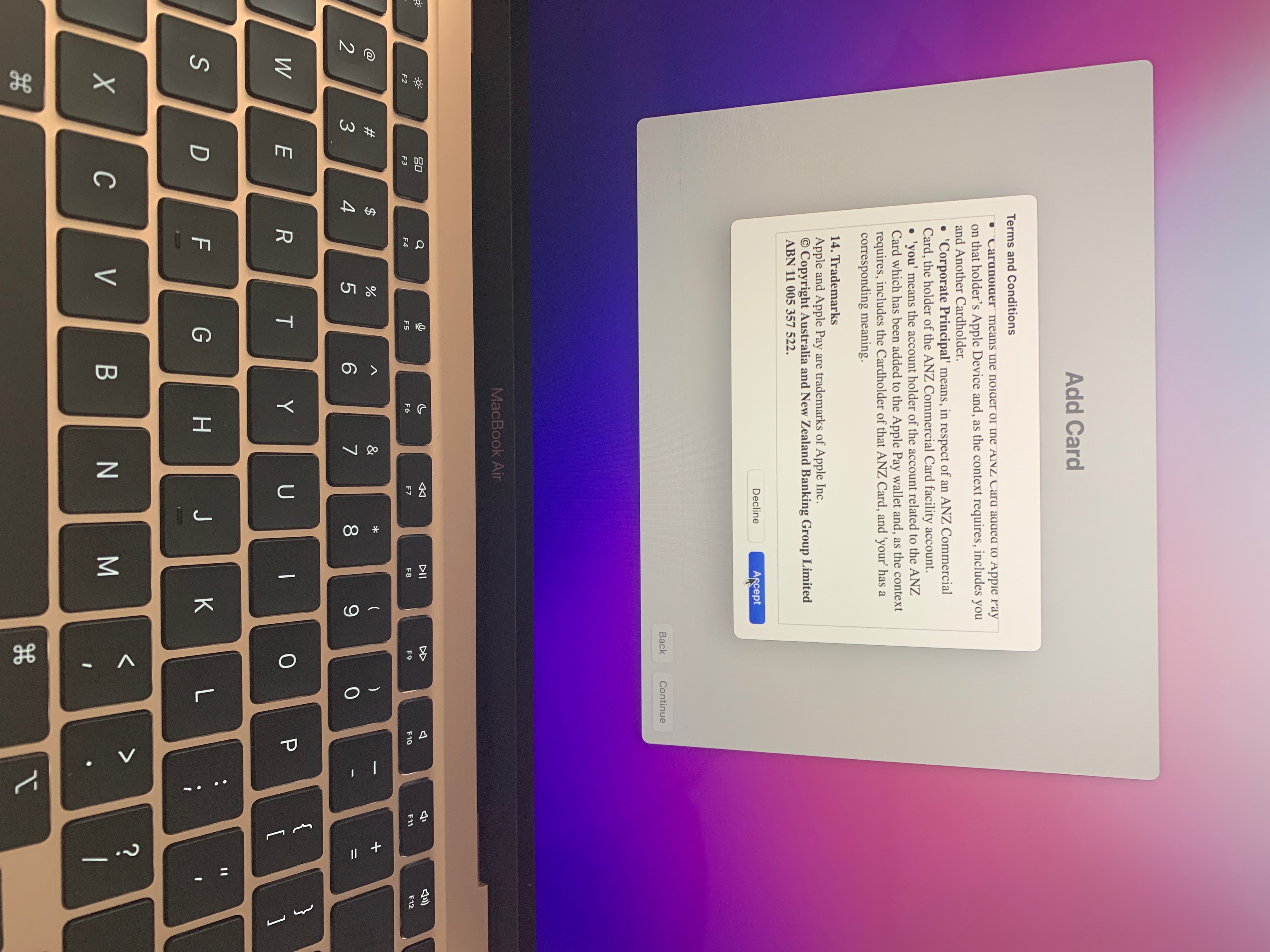 Setting up a new Mac, it’s stuck on the add a card to Apple Pay agreement. I click accept and it won’t continue, if I click decline it still won’t continue. I tried restarting and it goes straight back to the same page and won’t let me continue.