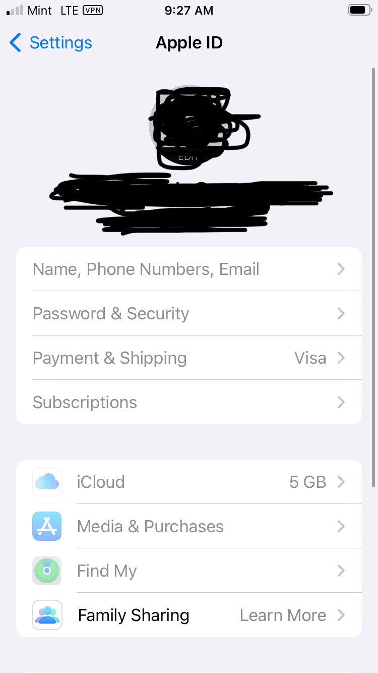 Whenever I click on my name in setting to access ICloud, subscriptions, etc. all the options are greyed out.