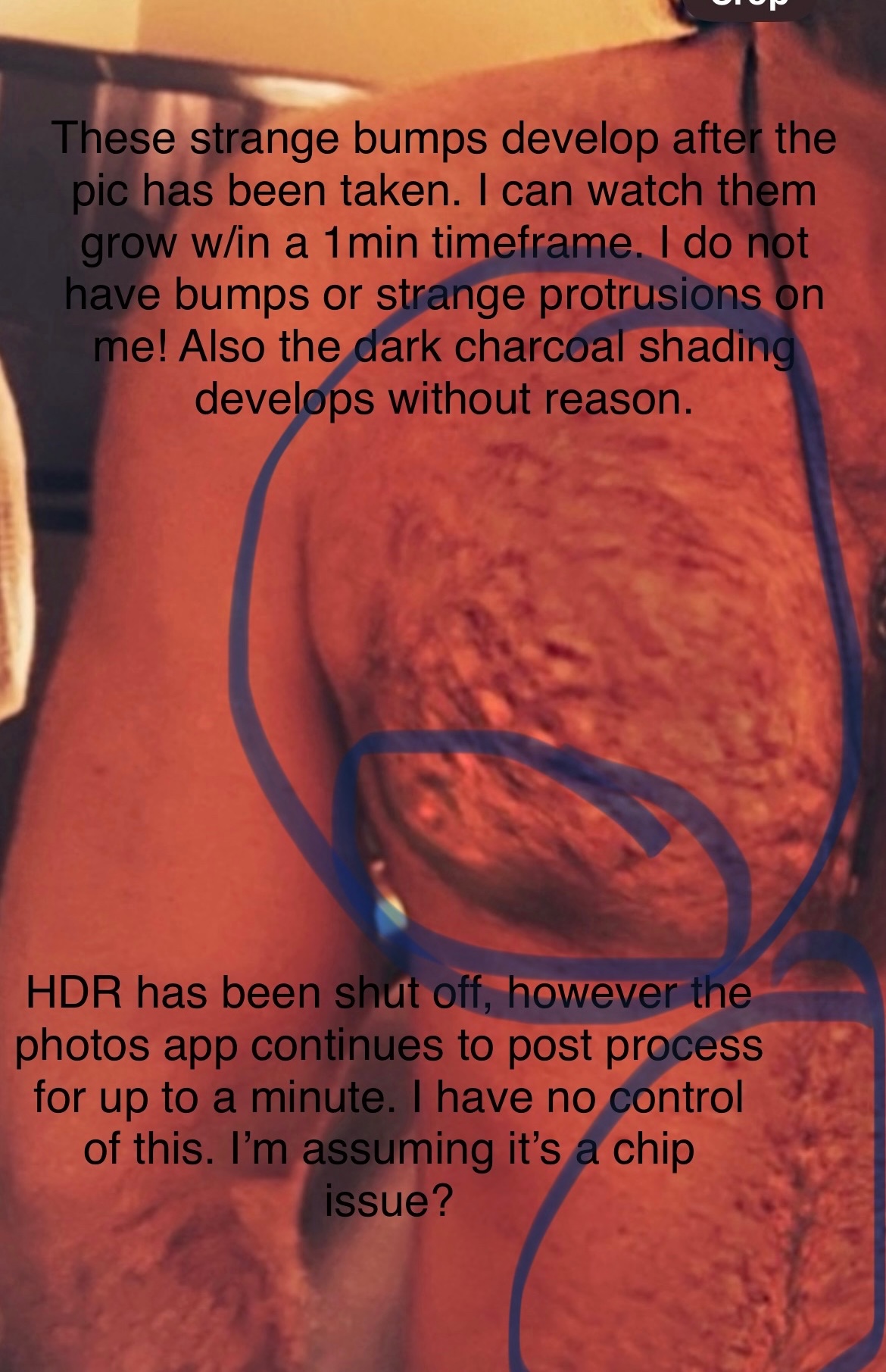 Here is the WORST part: the phone will continue post developing ON PICS THAT WERE TAKEN MONTHS AGO and ruin those pics if I simply open the pic in the photos app. Huge, wart-like bubbles on any skin, washed colors, etc. completely ruined hundreds of photos and memories. And I cannot reverse that awful post developing. I don’t have the option of taking RAW photos on this model. I can’t turn off HDR. It’s insane.