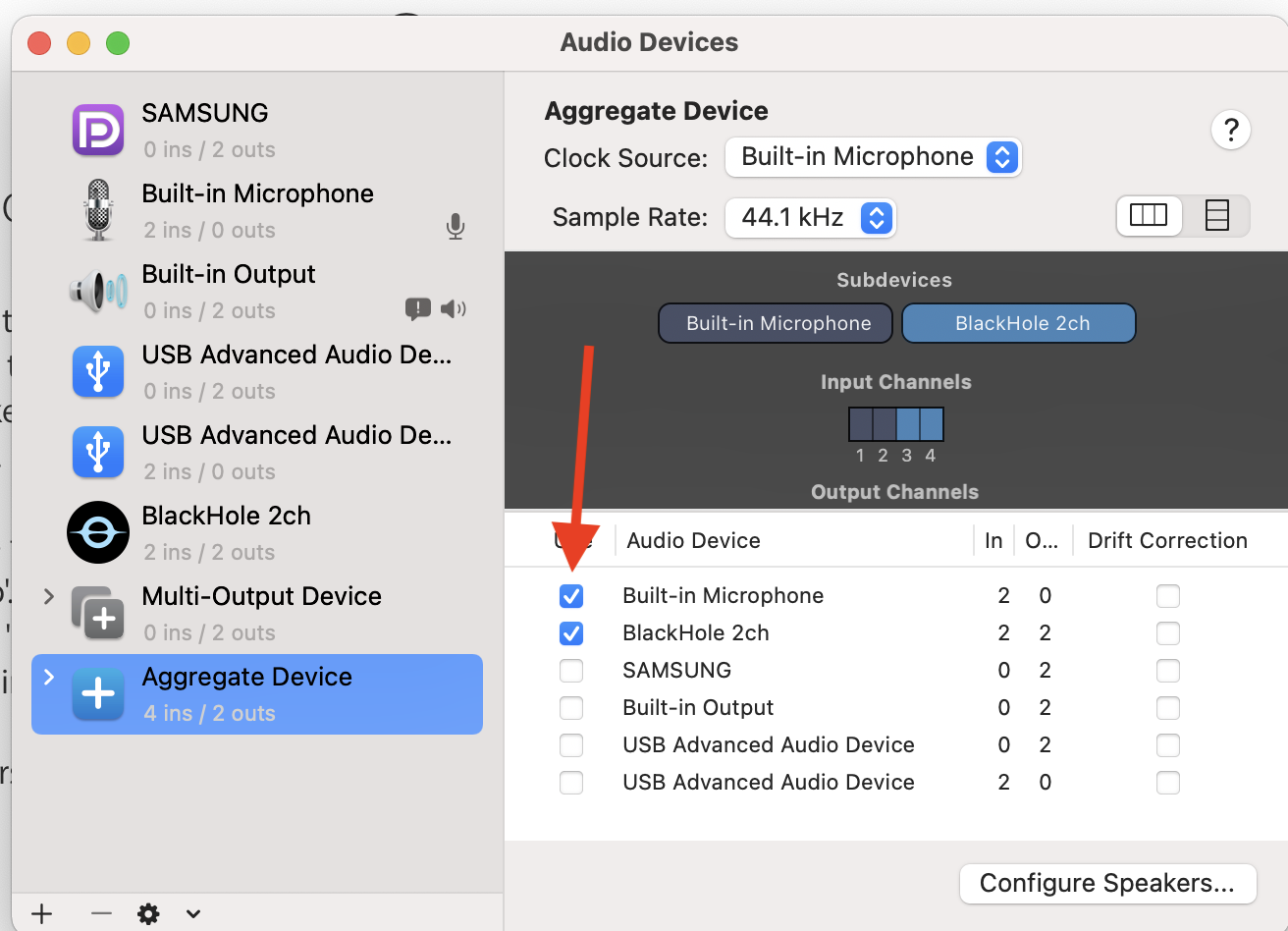 then in the panel that appears on the right, in the Aggregate Device tab, select “BlackHole 2ch” AND “Built-in Microphone”